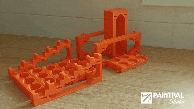 PaintPal Studio consists of stackable and configurable storage racks that clip together using the popular OpenLOCK clipping system.Each core rack is made up of five paint pot modules that clip into the structural frames. The paint modules are designed both flip-top and dropper bottles and cover a wide range of popular brands.