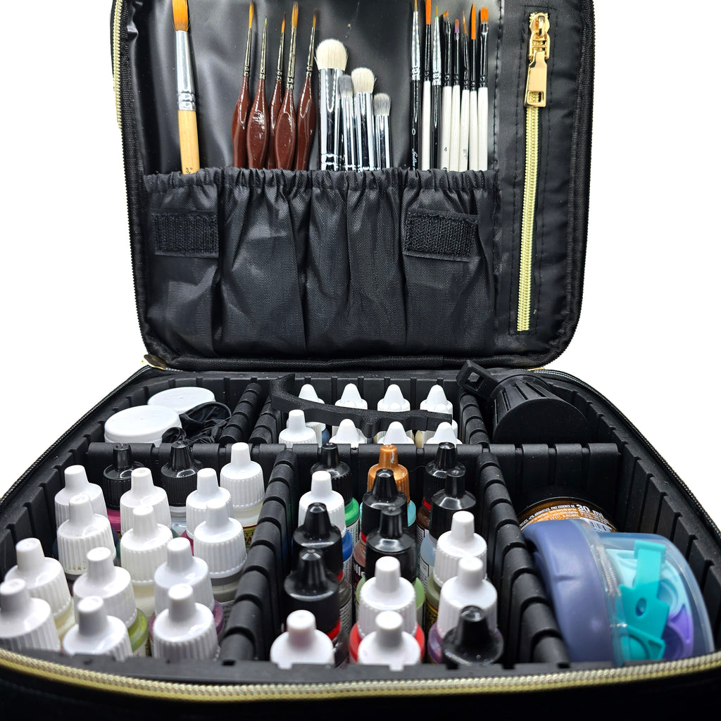 With dimensions of 25.4cm x 23.6cm x 9.5cm, this compact yet spacious case is ideal to hold dropper bottles from brands like Two Thin Coats and Army Painter, plus loads of brushes up to 21.5cm tall—all protected by a hard plastic interior. The adjustable slotted compartments let you customize your setup, while the protective flap ensures brushes stay clean. And with a sturdy carrying handle, taking your hobby on the road has never been easier!